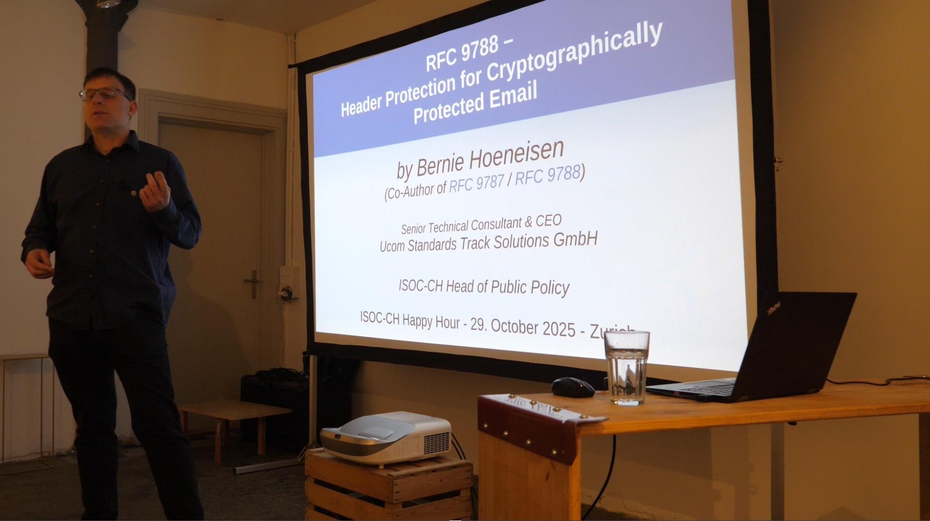 On the second input talk, Bernie Höneisen (Ucom.ch / ISOC-CH) showed ongoing developments from the IETF space which aim at making email encryption more accessible and useful. Main focus was put on the latter part. Using S/MIME or PGP/MIME, emails can be protected body-wise. However, the protection of current email systems typically does not include the header section. But the latter may contain sensitive information; e.g. the Subject header field might give enough clues on what a communication is about (without even knowing the messages’ content). To also protect sensitive information contained in the header section of an email, the IETF recently published a new standard (RFC 9788). In addition to protecting header fields, the document provides means to protect against a few other attacks as well as mechanisms to avoid protected information inadvertently leaking to unprotected (parts of) reply or forwarded emails. As Bernie pointed out and as it can be seen in his slide deck, tests in the past showed that existing header protection attempts showed different kind weaknesses in rendering emails. This included artifacts like having to click on attachments to open an email or even getting nuisance warnings regarding security. Using RFC 9788, also legacy email clients can render the received message without major issues. RFC 9788 describes in details how emails with header protection are created, rendered and replied to in a secure and private manner. Furthermore it includes test vectors and a lot of other useful information. Along with RFC 9788, the IETF also published RFC 9787 providing guidance on End-to-End Email Security for implementers of email systems.